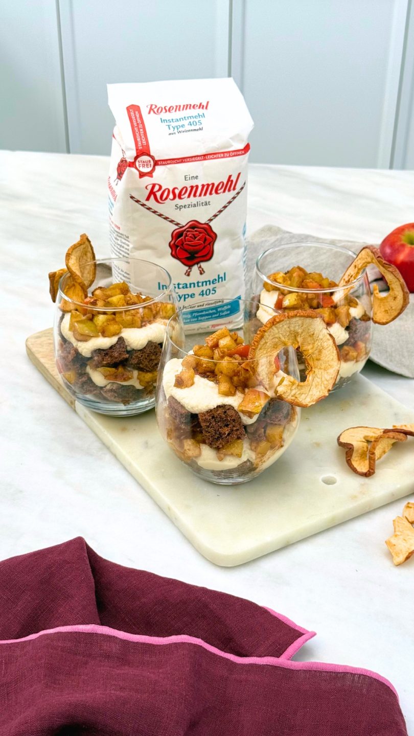Die fertigen Gläser mind. 1 Std. kaltstellen. Anschließend mit Apfelchips garniert servieren.