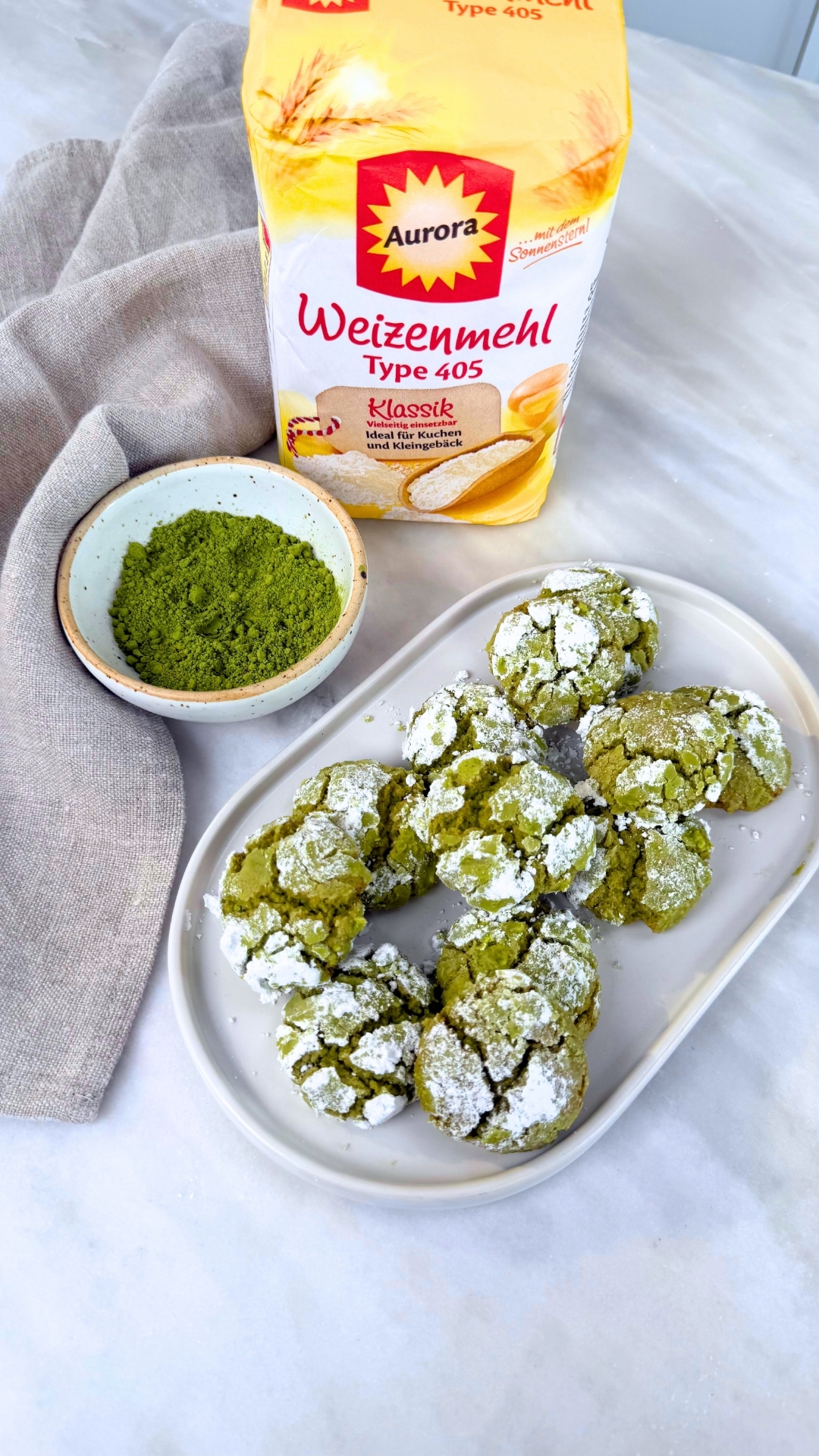 Für den Teig am Vortag Butter, Zucker und 1 Prs. Salz mit den Quirlen des Handrührgeräts cremig rühren. Ei unterrühren. Mehl, Backpulver und Matcha mischen, sieben und unter die Butter-Zucker-Masse kneten. Den Teig anschließend abgedeckt über Nacht kaltstellen.