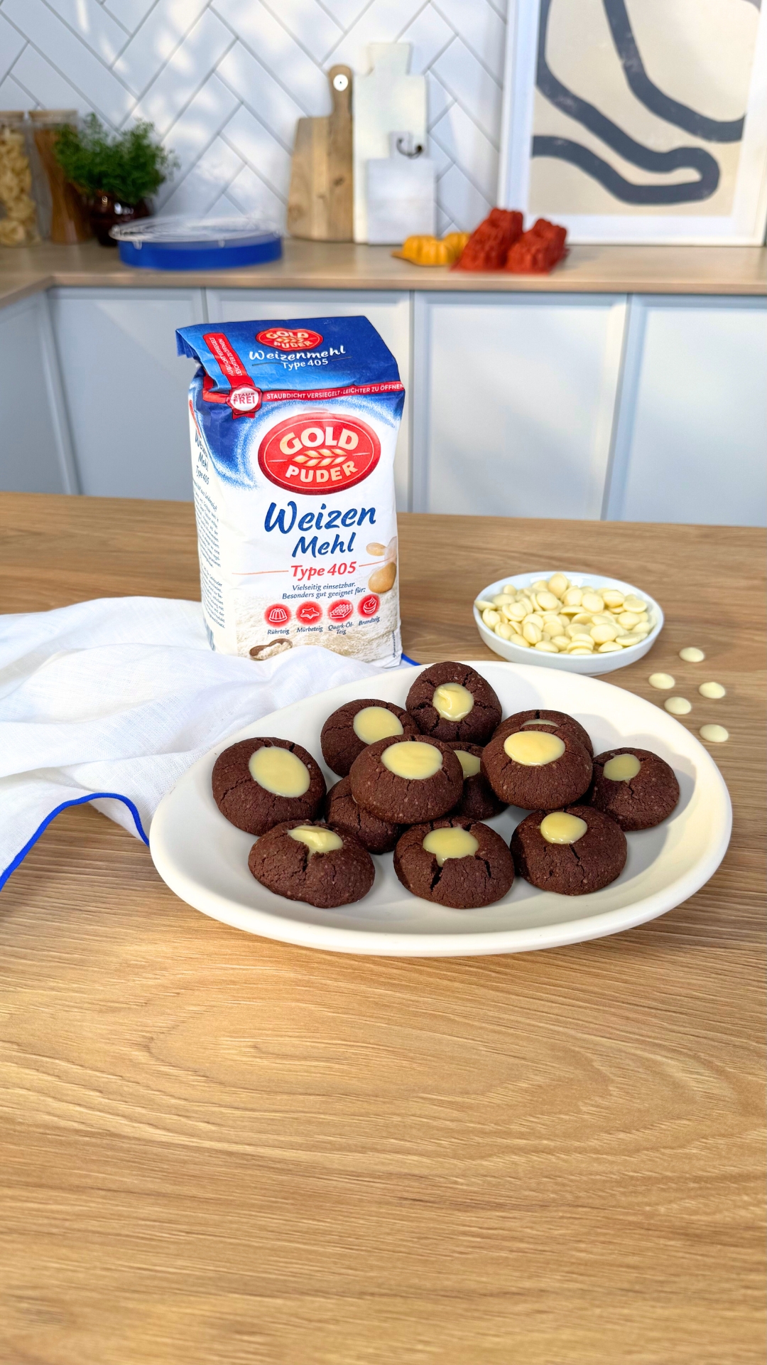 Den Ofen auf 160°C Umluft vorheizen. Den Teig aus dem Kühlschrank nehmen, daraus ca. walnussgroße Kugeln formen und auf einem mit Backpapier ausgelegtem Backblech verteilen. Mit dem Stiel eines Kochlöffels jeweils ein Loch in der Mitte eindrücken. Im Ofen ca. 10–12 Min. backen. Tipp: Wenn der Teig schon etwas weicher ist, nochmal 10 Min. in den Kühlschrank stellen, damit er beim Backen nicht auseinanderläuft.