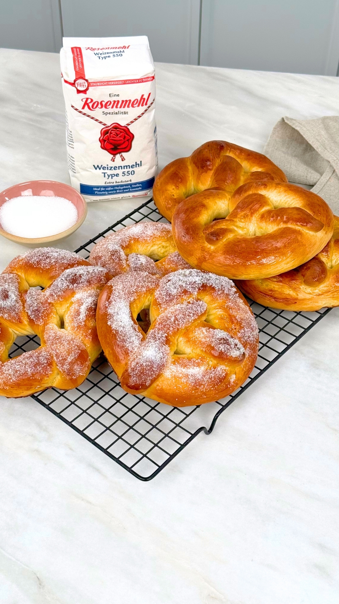 Hefeteig in etwa 6 Portionen (à ca. 165 g) teilen und auf einer leicht bemehlten Arbeitsfläche rund schleifen. Weitere 10 Min. abgedeckt ruhen lassen. Danach jeweils zu kurzen Strängen (etwa 25 cm) rollen. Nochmal 10 Min. ruhen lassen und anschließend jeweils zu einer ca. 90 bis 100 cm langen Teigrolle formen. Auf einem mit Backpapier belegten Backblechen zu Brezeln formen. Dafür die Enden zweimal verschlingen und an den unteren Bogen drücken. An einem warmen Ort abgedeckt weitere 30 Min. gehen lassen.
